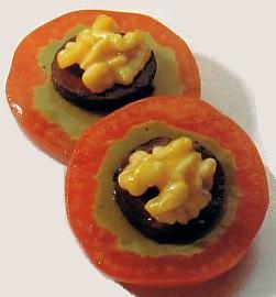Когда крем затвердеет, разрезать помидоры вдоль пополам либо нарезать толстыми