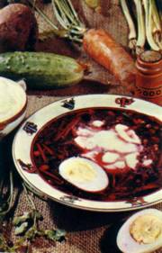 В тарелку со свекольником влить сметану, растертую с вареным яичным желтком