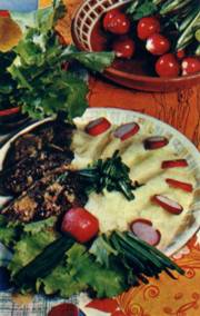разрезать на мелкие кусочки и перемешать с картофелем.